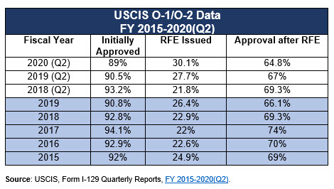 The rate of O-1 approvals is down by nearly 5% from its recent high of 94.1% in FY 2017. O-1 petitions were approved at a rate of 89% in the second quarter of this year, down 0.5% from the same period in FY 2019. The RFE rate rose to 30.1%, up just over 2% from the second quarter of FY 2019. Post-RFE approvals declined, to 64.8% from 67% in Q2 of FY 2019.o